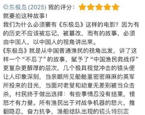 早几年已经有一部纪录片还原了90%的历史真相, 其中包括英军战俘后代,渔民后代,甚至参与屠杀的日方后代。 如今再看《东极岛》,且不说救的到底是谁, 就中国渔民的壮举也应当被歌颂, 出发点是好的,只是涉及的人比较复杂。